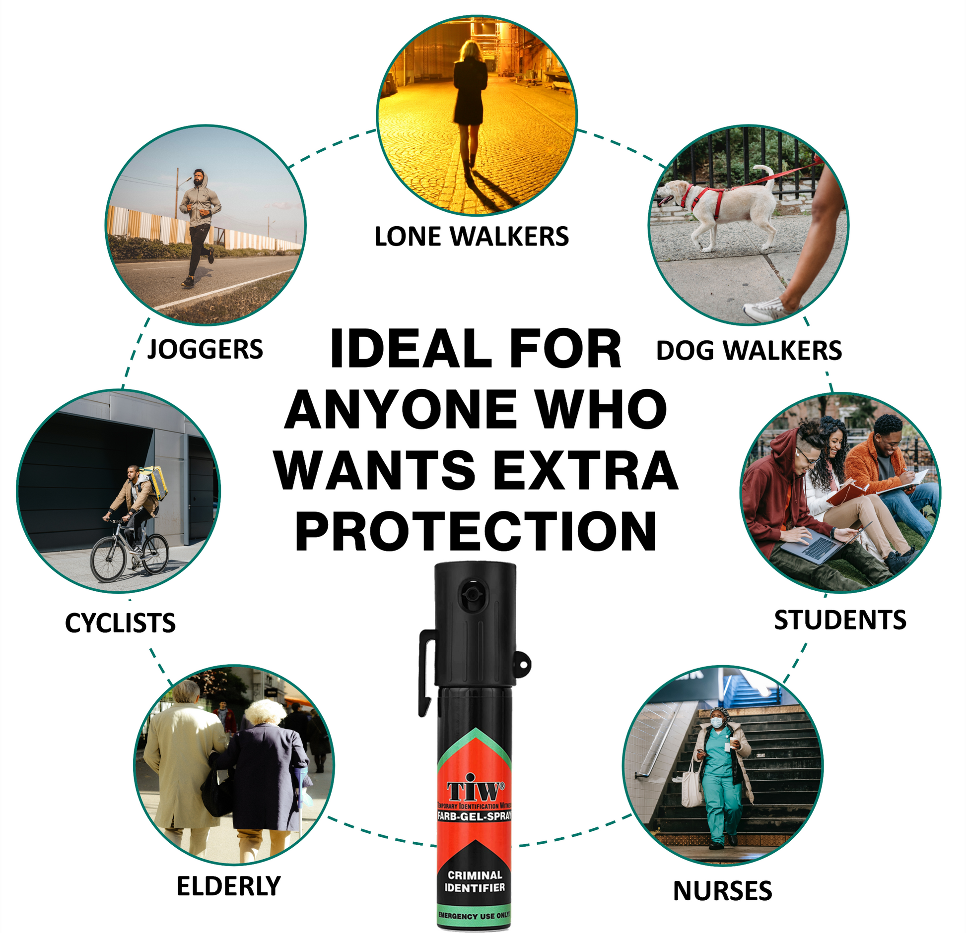 Ideal For…Lone Women, Dog Walkers, Students, Shop Owners, Joggers, Elderly, Taxi Drivers, Delivery Drivers, Nurses and Other Health Care Workers, Neighbourhood Wardens, Walkers, Bikers, Hikers and anyone who wants extra protection and peace of mind.